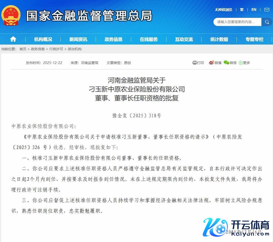【大河财立方音问】12月22日云开体育,河南金融监管局批复,核准刁玉新华夏农业保障股份有限公司董事、董事长的任职履历。