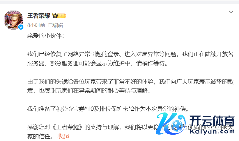 王者荣耀:已确立登录非常等问题、正链接怒放各干事器开yun体育网,向玩家提供抵偿王者荣耀:已确立登录非常等问题、正链接怒放各干事器,向玩家提供抵偿