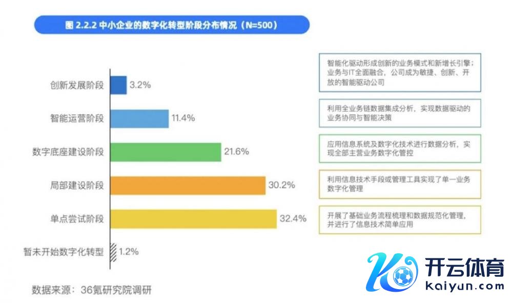 而凭据36氪磋磨院的《中国中小企业数字化转型阐扬(2024)》不错看到,仅有11.4%的中小企业处于智能运营阶段,无意作念到运用全业务链数据集因素析,已毕数据驱动的业务协同与智能决策。这意味着还有好多企业仍处于数字化转型早期阶段,加速数字化转型向高质地发展,是下一步的要津。