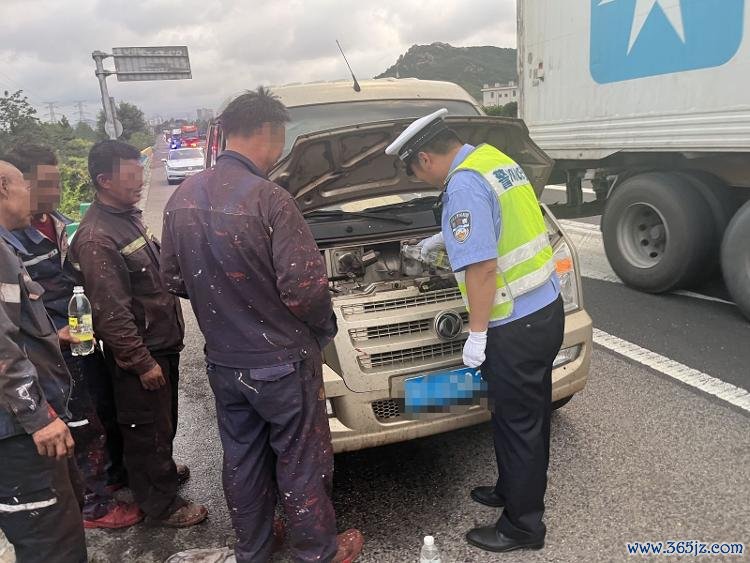 8月1日下昼18时许,青岛市公安局交通处置支队董胶高速公路大队一中队民辅警查察至疏港高速西海岸路段时,发现一辆外地派司面包车打着双闪灯停泊在济急车谈内,几名工友站在车头处,显得止境焦躁。查察民警立行将警车停泊在该车后方作念好安全看守。
